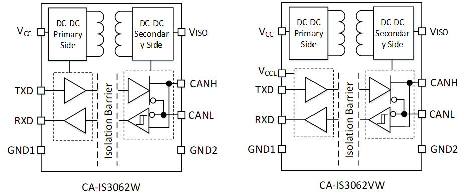 CA-IS3062x器件在逻辑侧采用+5V单电源供电,由内部DC-DC转换器产生总线侧供电电压,外部只需少数几个旁路电容即可构成完整的隔离CAN接口。收发器支持高达1Mbps的传输速率,并在驱动器输出端提供限流保护、热关断保护以及±58V的总线故障保护,显性状态超时检测则可避免由于控制器错误或TXD输入故障而导致的总线闭锁。此外,该器件的CAN接收器输入具有±30V的共模输入范围(CMR),远远超出ISO 11898-2规范定义的–2V至+7V范围,为系统提供更可靠的保护。CA-IS3062x器件在逻辑侧提供DC-DC转换器和CAN收发器供电独立的版本(CA-IS3062VW),便于逻辑侧与低压控制电路的信号交互。